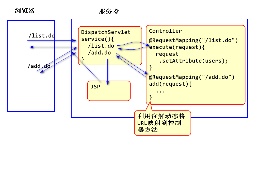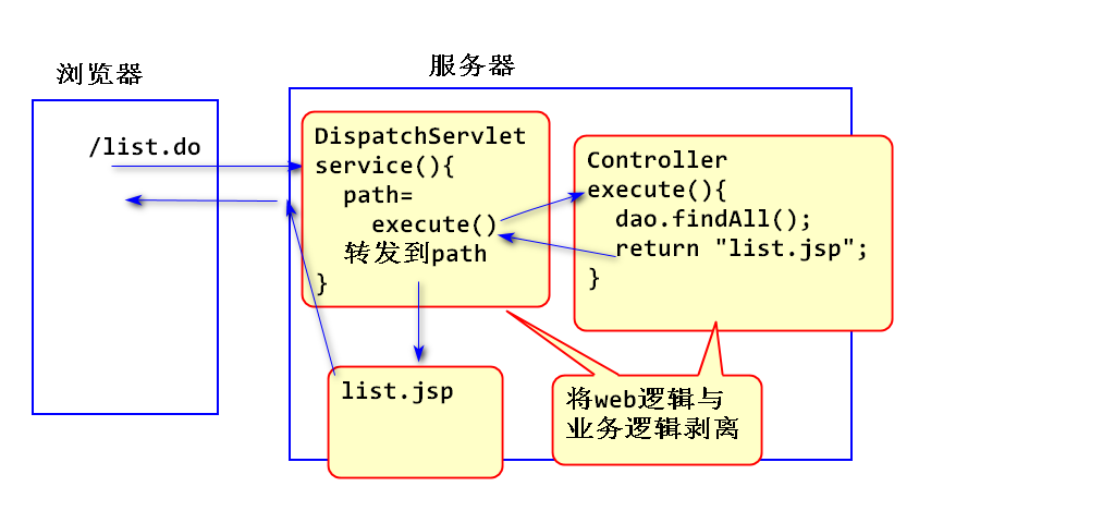 拆分的目的是将Web编程逻辑与业务处理逻辑进行剥离,将Web编程逻辑封装到前端控制器,达到简化子控制器逻辑,复用前端控制器的目的。